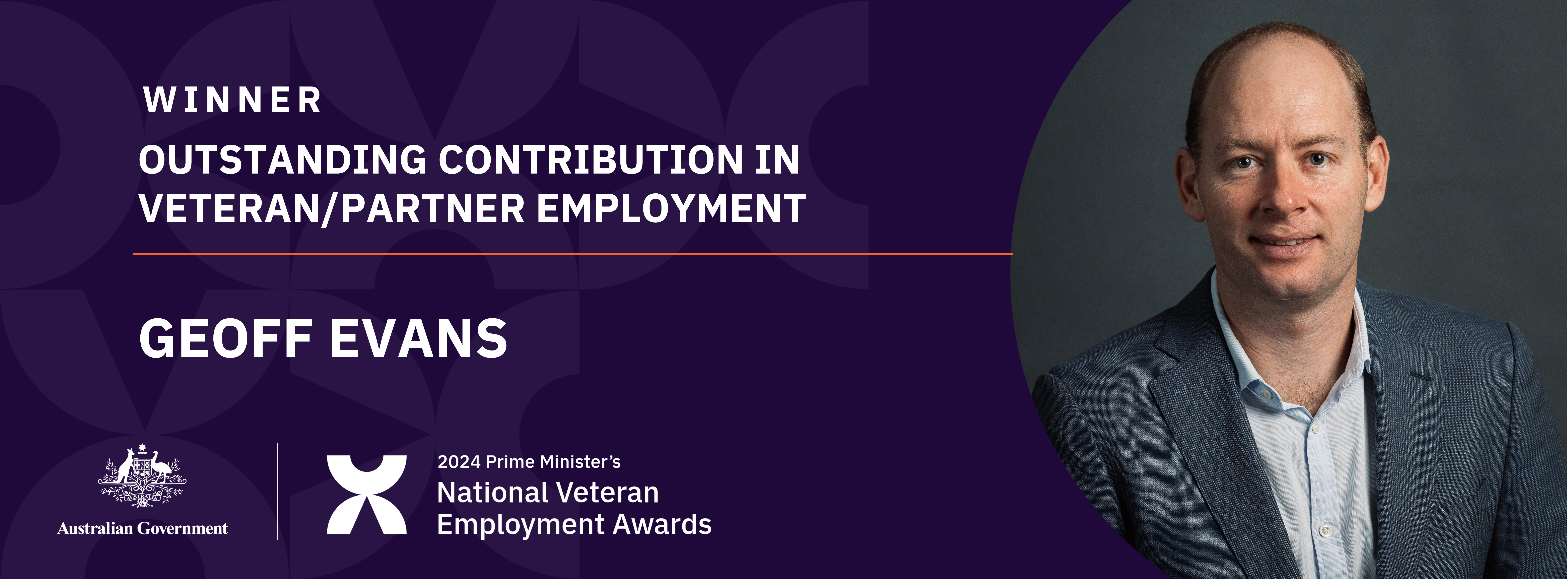 White text on dark purple background: winner - outstanding contribution in veteran/partner employment - Geoff Evans
